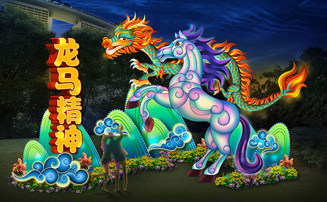 Admire flowers and blooms like plum blossoms, orchids, chrysanthemums and bamboo alongside displays including eight majestic, life-sized horse lanterns handcrafted by Chinese artisans using techniques that originated in the Tang Dynasty.