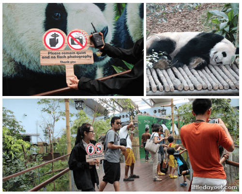 - Admission to the climate-controlled Giant Panda Forest is based on booking time slots. This limits the number of visitors viewing the pandas at any time and reduces the stress levels on these endangered animals. You can get your panda viewing tickets at the customer service counter or book your viewing time at the booking booths (which should be operating soon, just after the entrance of River Safari). Panda viewing is fixed at 15-minute intervals. It takes about half an hour to walk from the entrance to the Giant Panda Forest so plan accordingly.