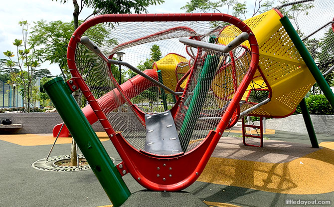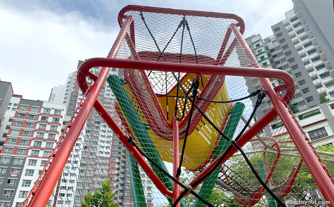 Found within the southern end of the park, the Senja Woods playground’s main feature is its elevated playground. Raised up on green “stilts”, the yellow pods are interconnected by a series of netted mesh bridges.