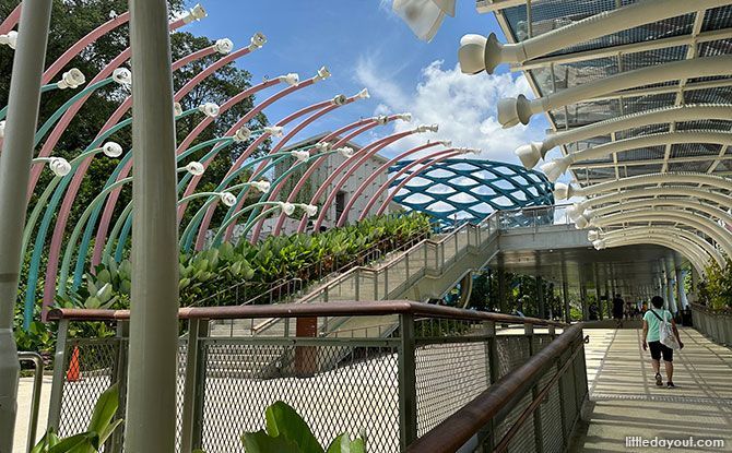 In place of the 37-metre-tall Merlion is a series of sensory gardens, laid out along the 350-metre-long connecting walkway with upper and lower decks that stretches from the edge of Resorts World Sentosa to the Beach Plaza and the Monorail Beach Station.