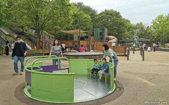 One reason families should visit Seoul Forest is the huge playground. There is one main section which includes long slides, slopes and ropes for climbing, a playground structure, merry-go-round and a water play section at the pond.