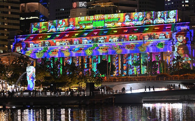 Share the Moment is a community project organised in partnership with the National Volunteer & Philanthropy Centre (NVPC), which features a collection of student artworks projected onto the facades– The Fullerton Hotel Singapore, the Merlion and ArtScience Museum.