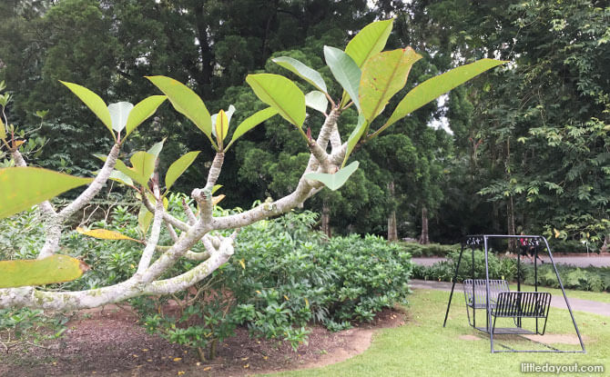 Amongst the frangipani trees and their craggily branches is a collection of swings. More than 10 of these swings – the garden variety – can be found scattered around the lawn of Singapore Botanic Gardens’ Frangipani Collection.