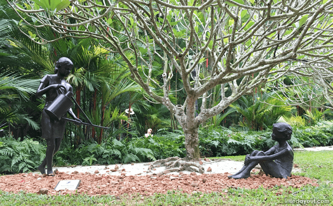 The sculpture Nurturing was donated by a member of the public, Myma Thomas, in memory of her late mother, Doris Thomas, who loved Singapore Botanic Gardens.