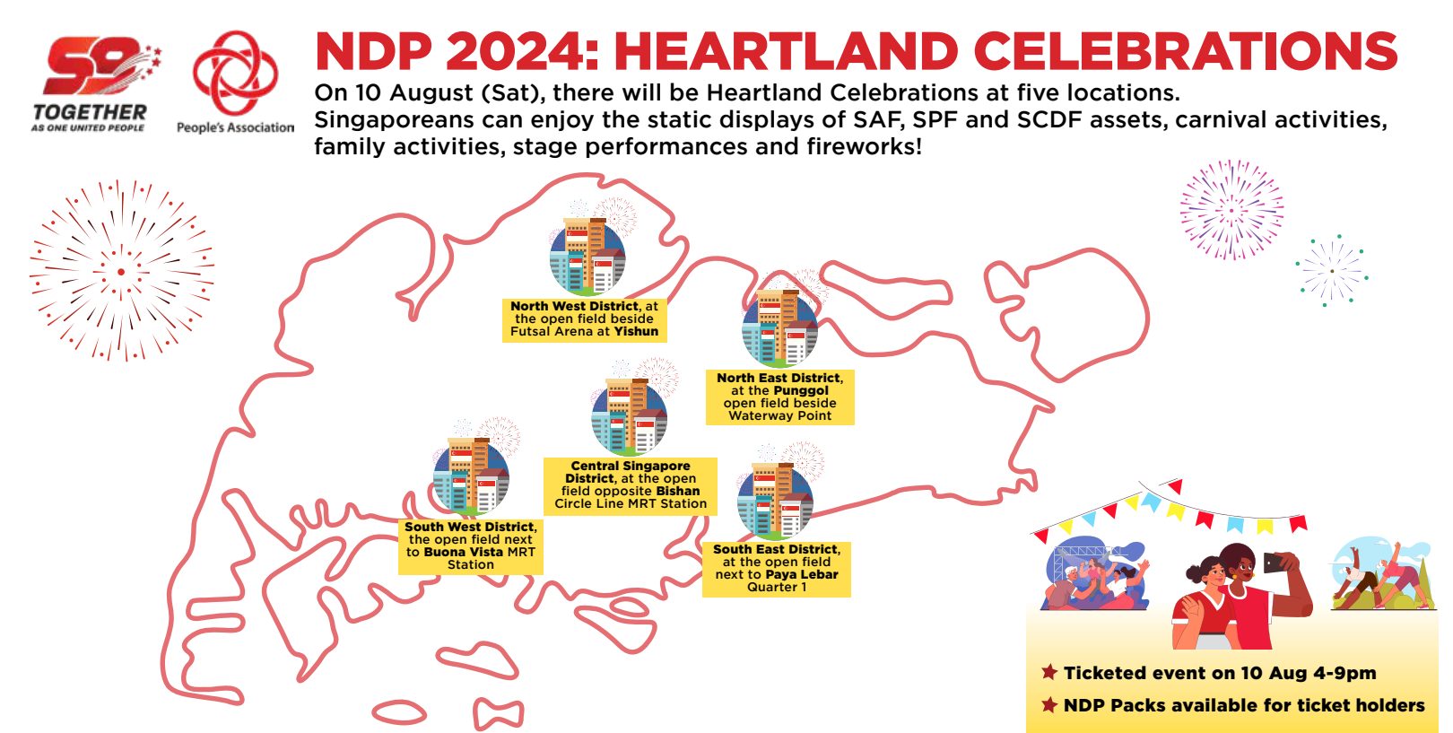 This year, fireworks will go off at the Padang and five heartland sites around the island on 10 August. These heartland sites are: