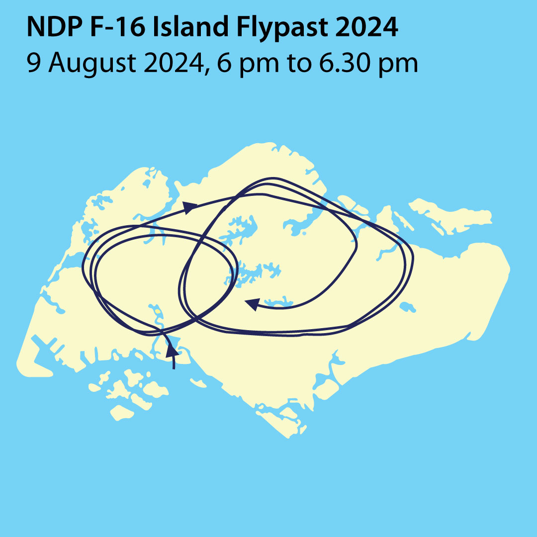 Six F-16s will conduct a flypast through the heartlands of Singapore. From around 6pm to 6.30pm, the flypast will greet Singaporeans at various locations around the island, such as Clementi, Jurong West, Choa Chu Kang, Bukit Batok, Woodlands, Toa Payoh, Seletar, Punggol and Bendemeer.