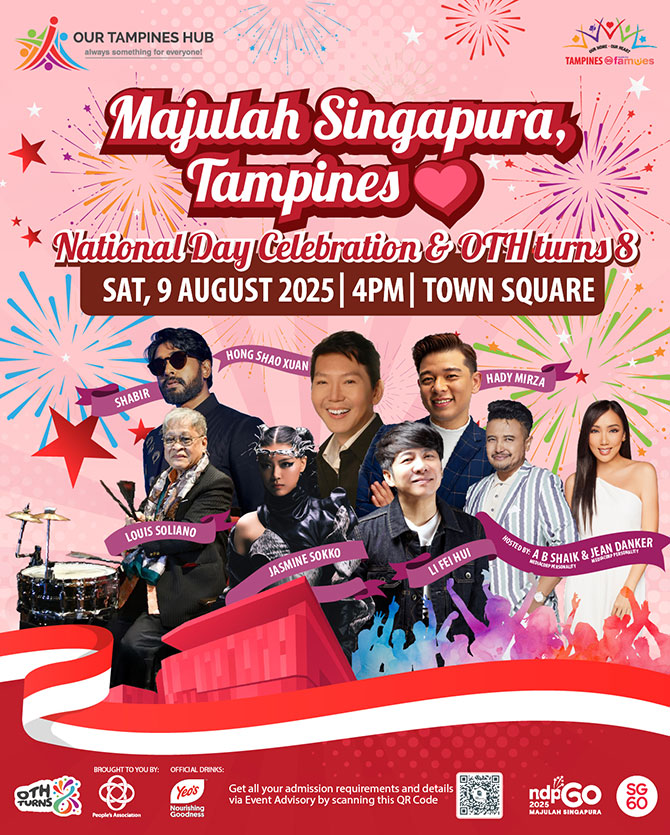 Our Tampines Hub is holding its 60th National Day 2024 Celebrations with a alive with a dynamic line-up of programmes from 8 to 10 and 16 August 2025. This year’s celebrations, themed “Majulah Singapura, Tampines ♥”, reflect OTH’s role as a space where residents from all walks of life come together to celebrate, connect, and strengthen community bonds. From the National Day Observance Ceremony to the OTH SG60 National Day Concert, music and dance performances, eco and wellness experiences and bumper car rides – there’s something for everyone to enjoy. Get more details about National Day celebrations at Our Tampines Hub.