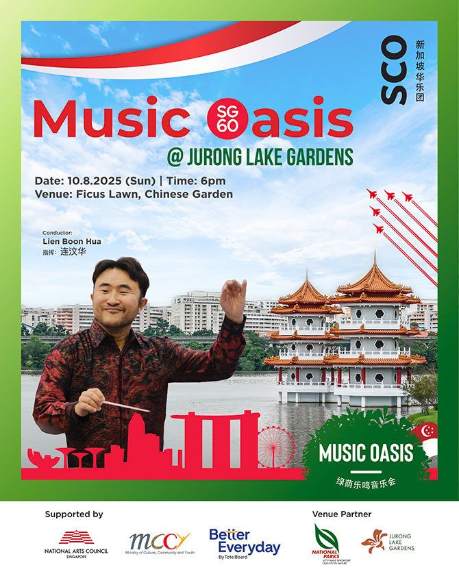 The Singapore Chinese Orchestra (SCO) will be performing a special Music Oasis concert this Sunday, 10 August 2025, 6 pm, at Ficus Lawn, Chinese Gardens. This free concert marks part of SCO’s SG60 celebrations, conducted by Associate Conductor Lien Boon Hua, featuring works that reflect Singapore’s rich multicultural heritage. Audiences can expect familiar favourites like Di Tanjong Katong, National Day Medley, Iyarkaiyin Kaatchi and more, all set against the beautiful lakeside backdrop of Jurong Lake Gardens. Get more details about Music Oasis.
