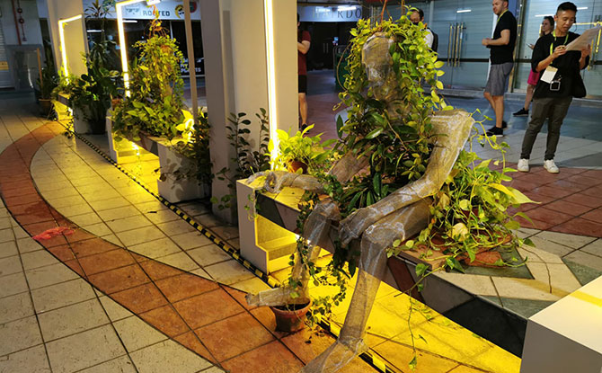 Outside Plaza Singapura mall, catch artist Yang Derong’s cyborg twist on the swordfish attacking Singapore. Cyberswordfish V2.0, is made from digital waste from an e-waste recycling company in Tuas. In Derong’s words, “Imagine all our e-waste got together and became drones flying over our sky – attacking and disrupting all our PayLah, PayNow and devices.” It’s an imaginative chaotic piece that will have passers-by stopping to see the various details.