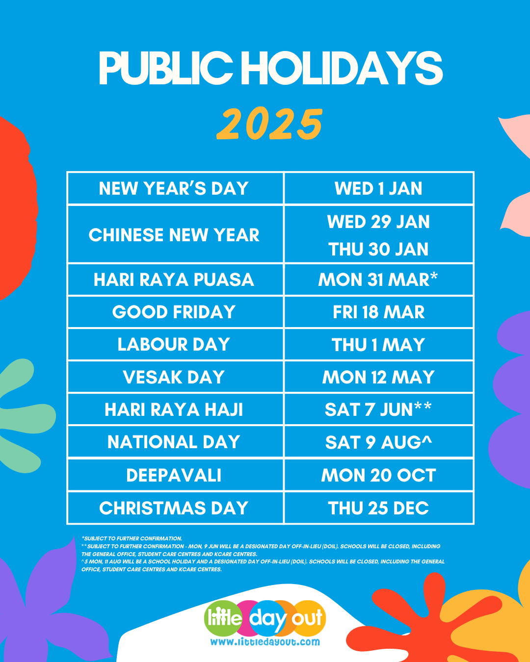 | Hari Raya Puasa | 31 Mar 2025 (subject to further confirmation) |