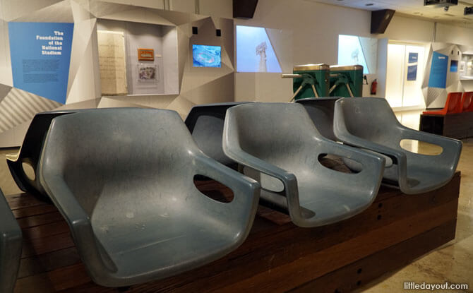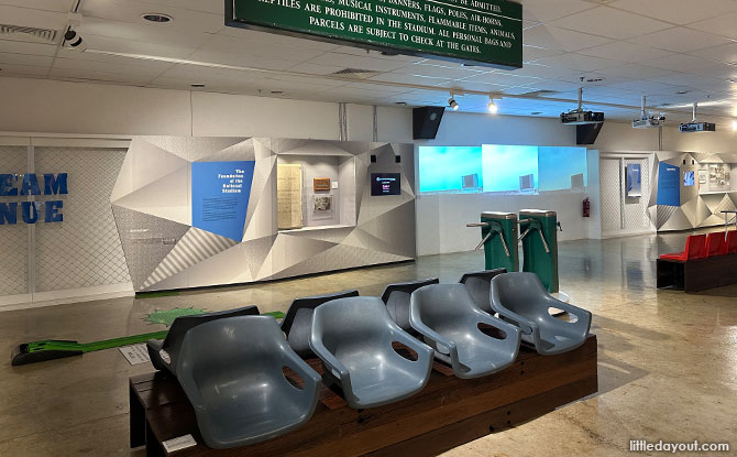 On display are artefacts preserved from the old stadium. These include gallery seats, turnstiles and the loudspeakers that were used at the former National Stadium.