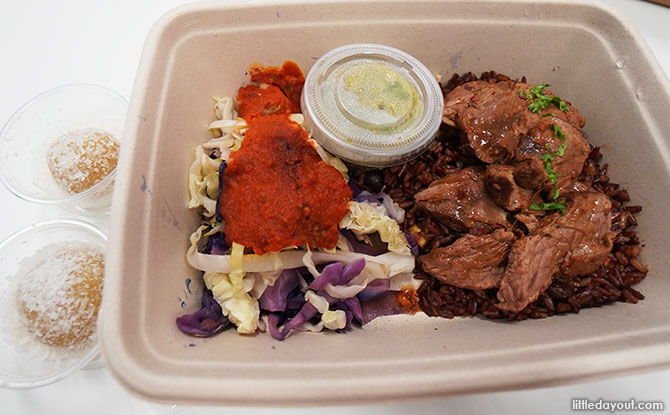 The beef was very tender, almost the texture of medium-rare but it looked fully cooked through. The brown rice was not as fluffy as we would have liked, but when consumed together with all the other ingredients, it didn’t bother us too much. The guacamole was really nice and creamy yet refreshing because of the generous dose of lime. The salsa had a hint of heat and the cabbage came crunchy despite it being delivered over in a hot meal. Impressive!