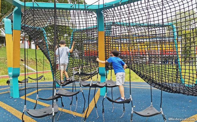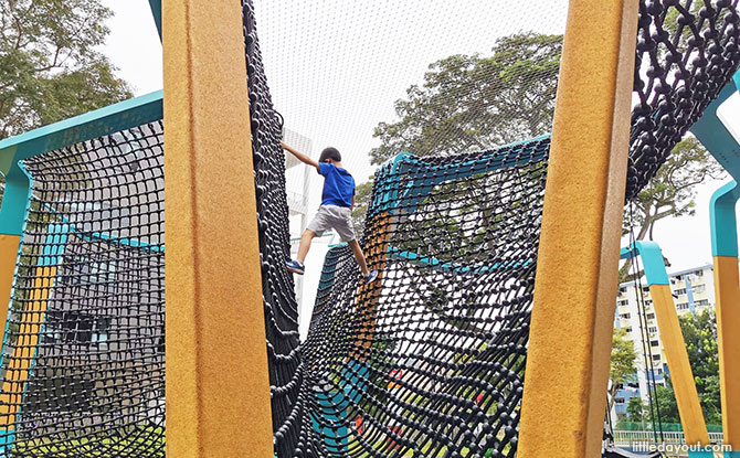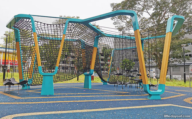Catering to their needs is the Sports @ Buona Vista playground. The aquamarine and yellow playground is a netted structure with multiple ways for kids and parents to enter in and play.