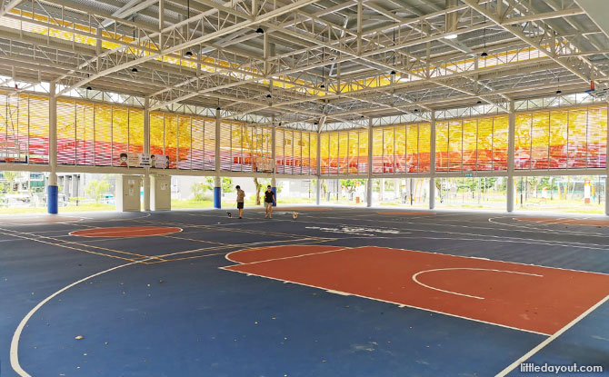 The most prominent structure at Sports @ Buona Vista is a large sheltered multi-purpose area which houses a basketball court.