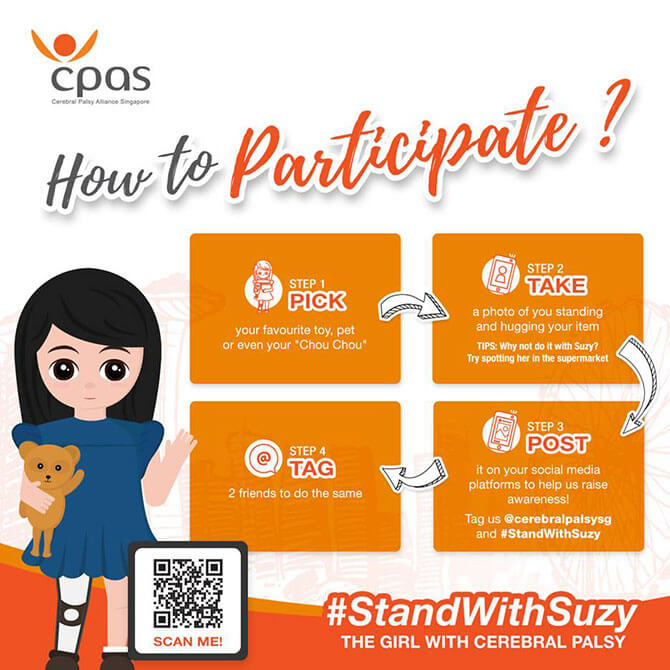 “Persons with cerebral palsy may need a great deal of effort to remain in a standing posture, or may not be able to stand independently. By standing with Suzy, we hope to create more awareness of persons with the condition, and support them in any way they can,” said Ms Latha Kutty, Executive Director, Cerebral Palsy Alliance Singapore.