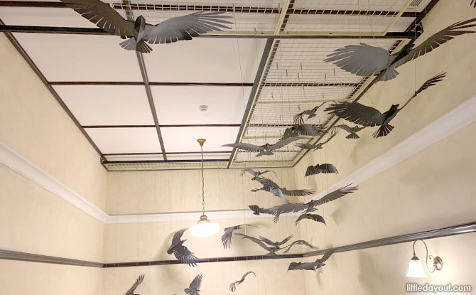 The installation recreates a scene recorded by Teo Eng Hock in Nanyang and the Founding of the Republic (1933) which described a flock of crows mysteriously flying into the villa the night the Tong Meng Hui Singapore Branch. It is made up of 40 suspended crows made of galvanised steel, in various flight patterns.