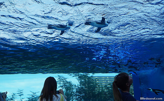 The penguins are kept in a glass enclosure that visitors can stand underneath and watch as the little birds “fly” through the water overhead.