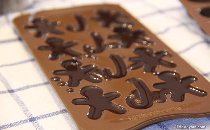 Tap the mould gently on the table to remove any air bubbles. Don’t worry if you spilt some liquid chocolate on the borders of the mould. When the chocolate has somewhat set (about an hour), simply scrape the excess off.