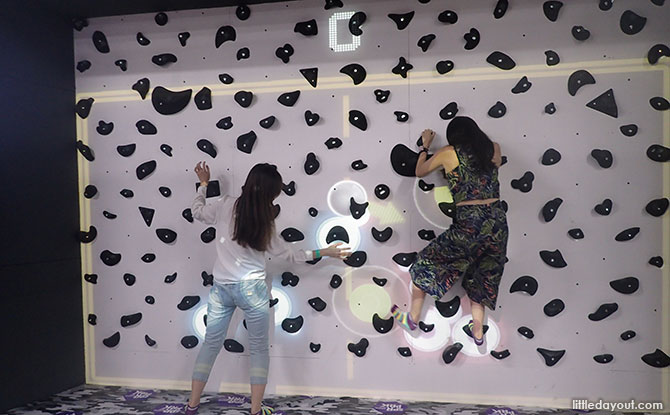 The augmented climb wall has many different interactive e-activities to choose from as well as adjustable difficulty levels.