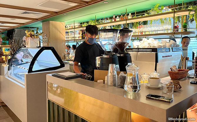 Parallel to the cafe seating, a long cocktail bar counter serves alcoholic drinks, specialty coffee roasters including ONA coffee and Seven Seeds and artisanal teas, adding to great vibes and a chill, relaxed atmosphere, coupled with warm, prompt and hospitable service. Additional counters displaying fresh bakes and premium ice-cream with flavours ranging from olive oil rosemary, blue pea vanilla, summer strawberries to Irish Coffee and dark chocolate Ferrero crafted by Creamier, will thrill dessert lovers!