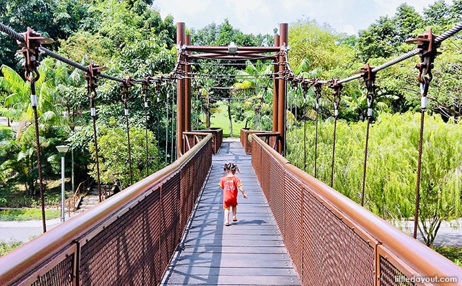 One of the five bridges which dot the Punggol Waterway, the Adventure Bridge is a suspension bridge that we personally wished was a bit more adventurous and swayed a bit more. The brown bridge is held up by cables on either side.