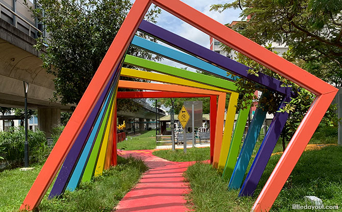 Kids will want to rush their way to the brightly set of coloured frames that form a tunnel along a red path.