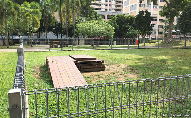Besides the playgrounds, other amenities within Tampines Central Park include exercise stations and a fenced off dog run.