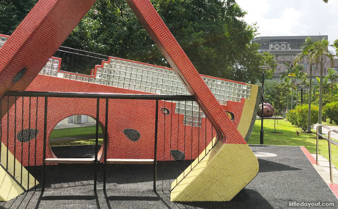 The Watermelon Playground at Tampines Central Park consists of two parts – a cross-section and a slice of the tropical fruit.