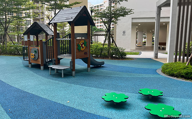 The playground has a main playhouse that has two different roofs and is interconnected with an elevated ramp. The playground with the higher platform is where children can slide down a short slide while the lower platform has more interactive play elements such as movable beads and a small “mailbox”. There are also a few small lily pads that children can jump across.