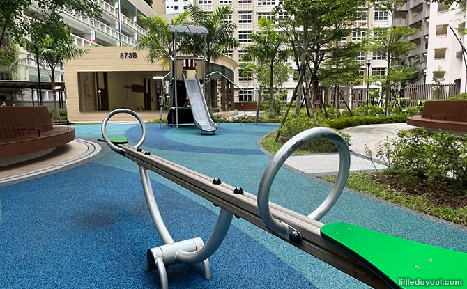 Another play element to enjoy is the see-saw which has a circular handle, instead of the usual bar to hold. We think that this might be ergonomically more pleasant to hold as compared to the older and more traditional design of a see-saw.