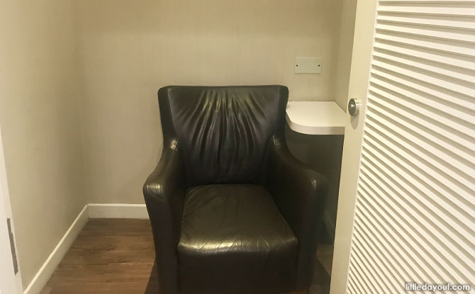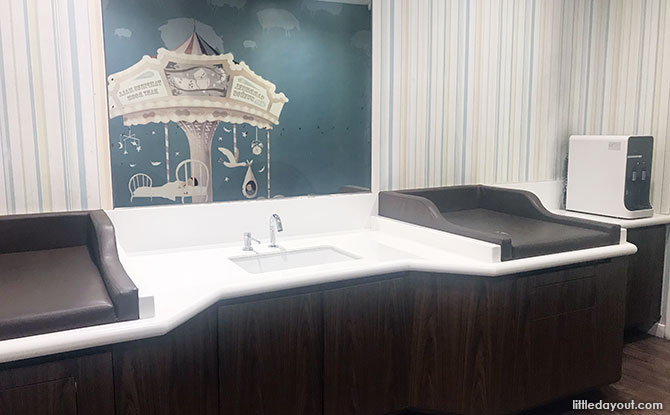 The nursing room at Tampines Mall is spacious and beautifully decorated with striped wallpaper and an illustration of a sleeping baby on a carousel. The nursing room is also well-equipped with two padded diaper changing stations, a hot and cold water dispenser and two private, lockable breastfeeding rooms. Each breastfeeding room is furnished with a comfy armchair and a small table, a safe haven for nursing mothers to breastfeed or express in privacy. However, there are no electrical points within the nursing room, which may be inconvenient for mothers who need to express their breastmilk. Do note that to enter the nursing room you have to press the intercom to ensure that the nursing room is not being misused for other purposes and that the room itself contains a CCTV.