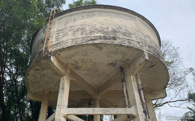 Situated at the top of a hill, the tall, concrete water tower is no longer in use, except as a photo spot for those who are curious.