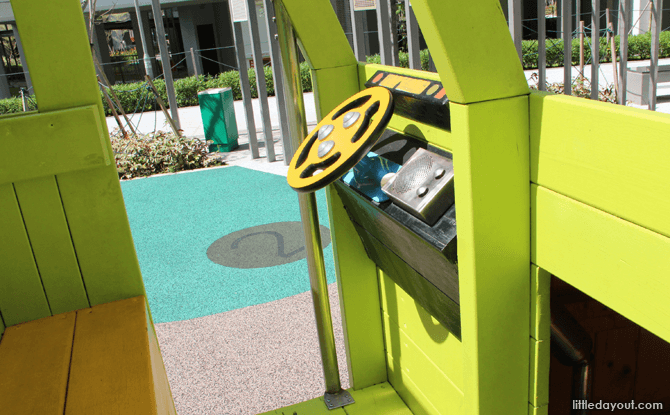 Colourful blue and green crates lie around the Truck playground at Keat Hong Mirage, perfect for kids to climb about and imagine they are on a mission to resupply the front lines.