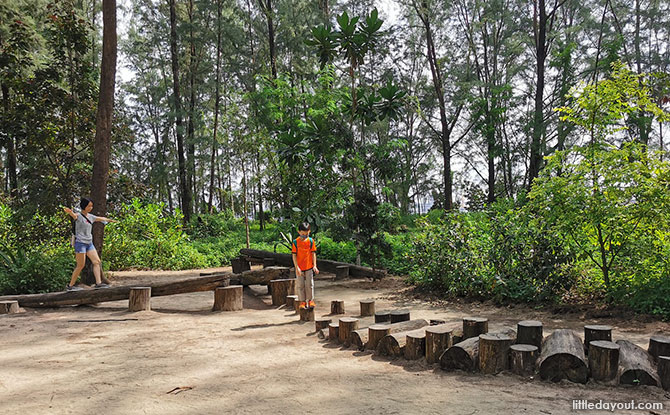 There are wooden bridges to step across and stepping stones to hop along and little triangular log fences for adventurous ones to climb over.