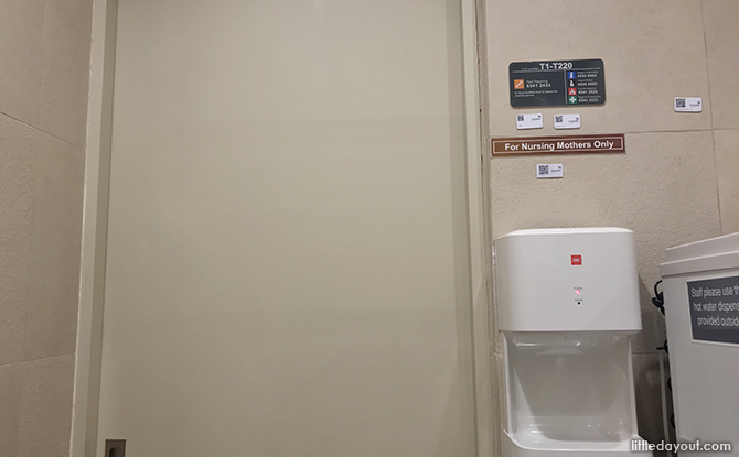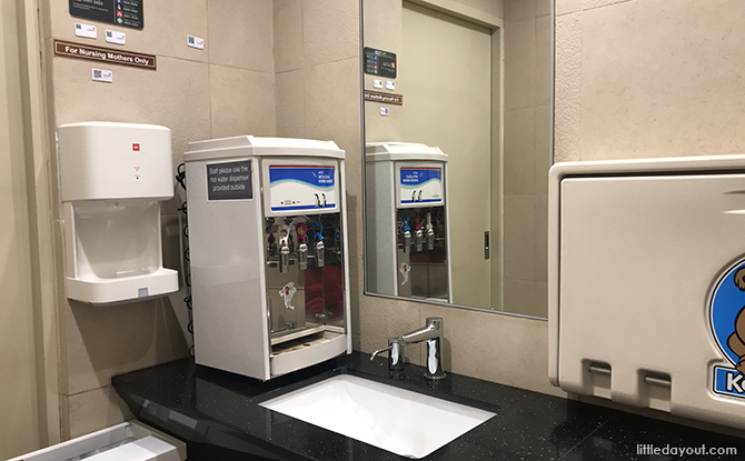 The Baby Care Room at Terminal 1 is minimally furnished but functional, housing a hot and cold water dispenser, a sink and a foldable diaper changing station. There is also a private breastfeeding room located within the Baby Care Room which is lockable and contains a cushioned seat with two electrical power points for nursing mothers to breastfeed in peace. In addition, there is a hot and cold water dispenser located outside the Baby Care Room to prevent any intrusion from other members of the public who may need hot water facilities.