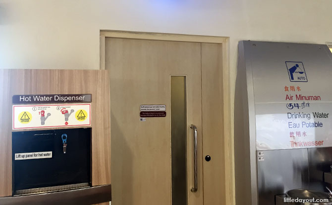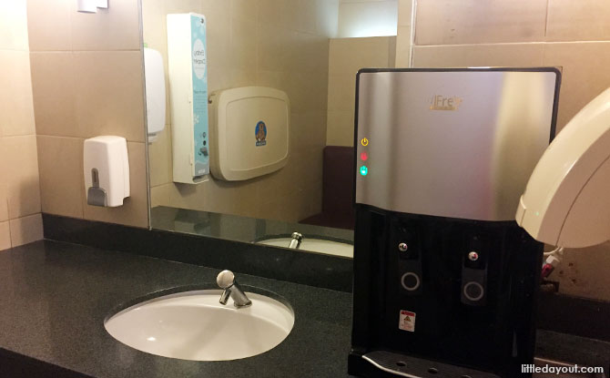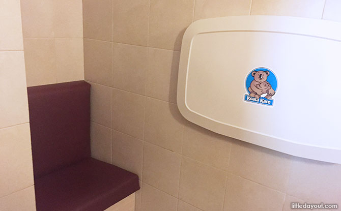 The nursing room at Waterway Point is clean and painted in soothing shades of blue with colourful illustrations of houses. The nursing room is also decently equipped with a bench, sink, hot and cold water dispenser as well as a padded diaper changing station. Nursing mothers who need a private space can seek refuge in the breastfeeding room which is lockable and consists of a comfy armchair, a small ledge and an electrical point. Do note that you need to press the intercom in order to use the room, a security measure to ensure that the nursing room is not misused.