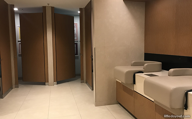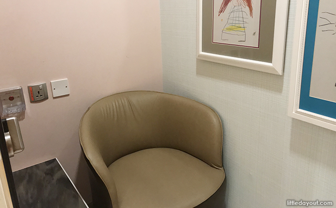 The nursing room at Level 2M is clean, brightly-lit and spacious- large enough to comfortably accommodate several families and strollers at any one time. Located within the Food Emporium of Terminal 4, the nursing room is well-equipped with two cushioned diaper changing stations, a sink and a hot and cold water dispenser. There is even a place for parents to park their prams before tending to their children. In addition, there are four private breastfeeding rooms that are all lockable and equipped with an armchair, electrical point and a ledge table. Nursing mothers can thus find a cosy spot to nurse in peace and privacy.