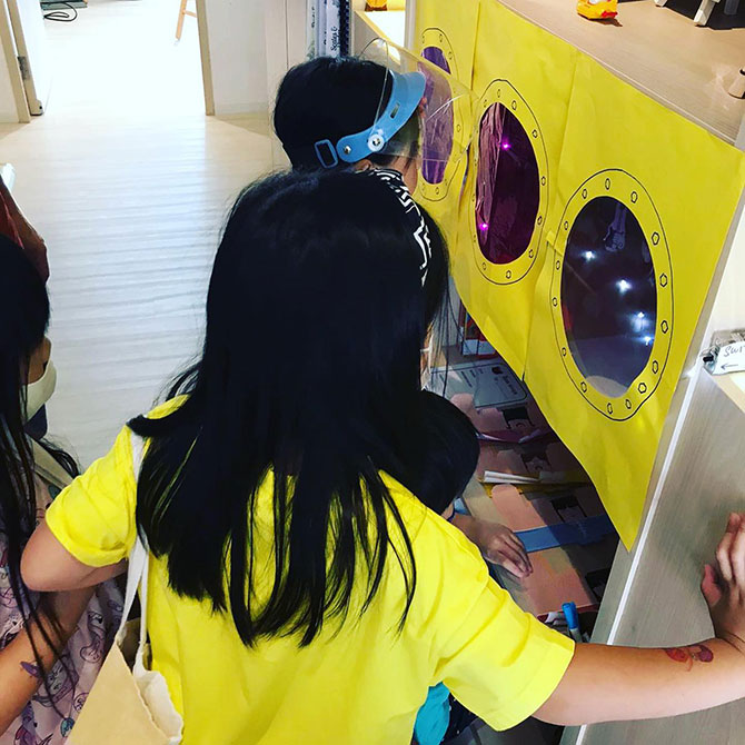 The creative museum-on-a-shelf has been decorated with port holes to look like the exterior of the Yellow Submarine. The attracts the attention of curious students at the music school who are more than eager to peer inside.