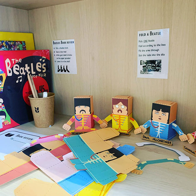 In The Beatles Mini Museum, students can pick up books on The Beatles or fold a paper craft version of one the members of the original boy band.