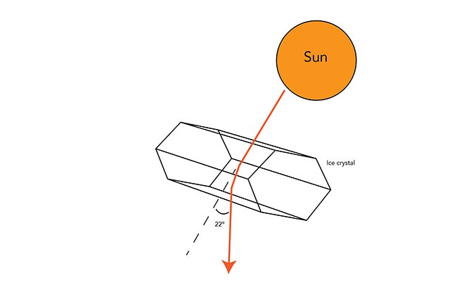 We’ve done up a simplified diagram above to help visualise how 22 degree halos occur.