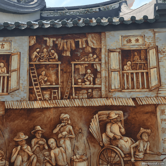 Starting from the right-hand side, the mural opens with poignant scenes of young men leaving their families behind. They then made the dangerous two-week sea journey from China to Singapore, knowing that they may never see their loved ones again.