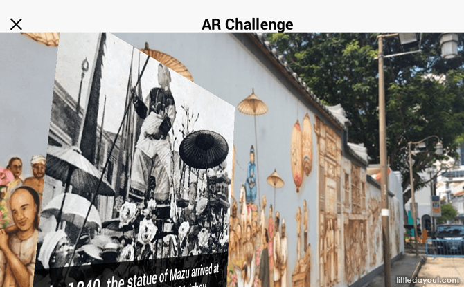 First, download LocoMole app and the Telok Ayer – Past and Present map. At the Hokkien Huay Kuan Mural point-of-interest, go to Things to Do and switch on the Augmented Reality mode. Next, scan the mural with the camera.