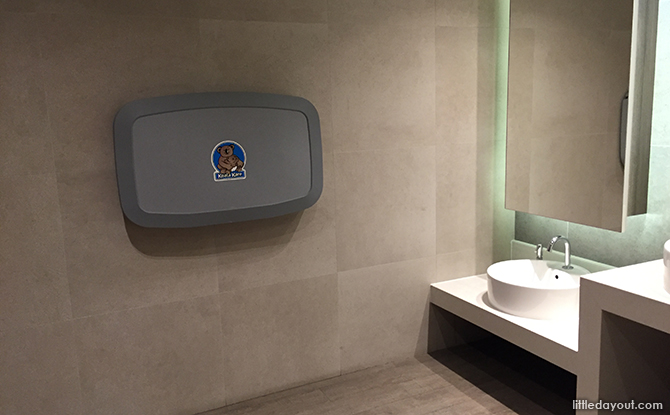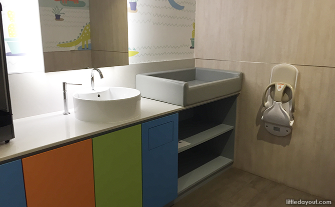 The Thomson Plaza nursing room is clean, spacious and nicely decorated with cute illustrations of dinosaurs. Well-furnished with a sink, cushioned bench, foldable diaper chair, hot and cold water dispenser as well as a cushioned diaper changing station, the room is functional and quite family-friendly. Do note however that there are no electrical points. Although the room only has one diaper changing station, a foldable diaper changing station can also be found in the female restroom.