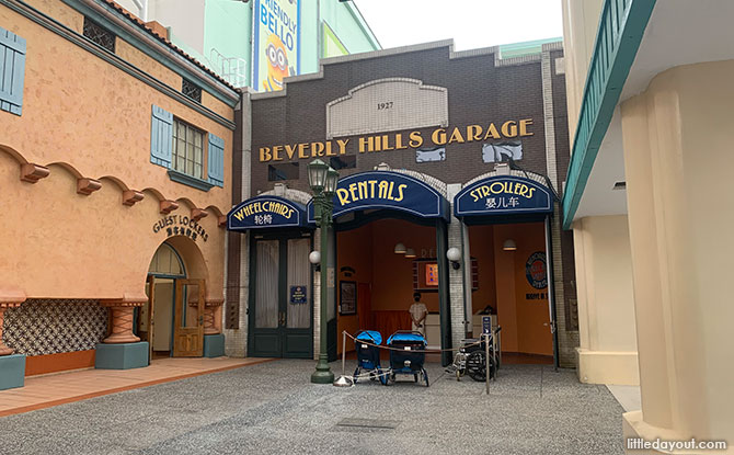 On the right, you can rent strollers and wheelchairs at the Beverly Hill Garage, put away luggage for the day in storage lockers, and find the first aid corner.