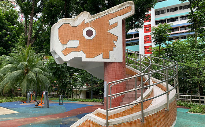 The large Dragon Playground is not the only one of its kind at Toa Payoh. There is a slide that takes after it at HDB Hub but, more authentically, there is another mosaic Dragon slide at Toa Payoh North along Lorong 1. Read more about the Dragon Tower at Lorong 1.