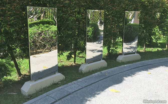Three mirrors, standing very much like the Marina Bay Sands towers, let little ones play peek-a-boo with themselves. For more tricks of the eye, peek through a little peephole for an optical illusion that magically creates a face from a few bent poles.