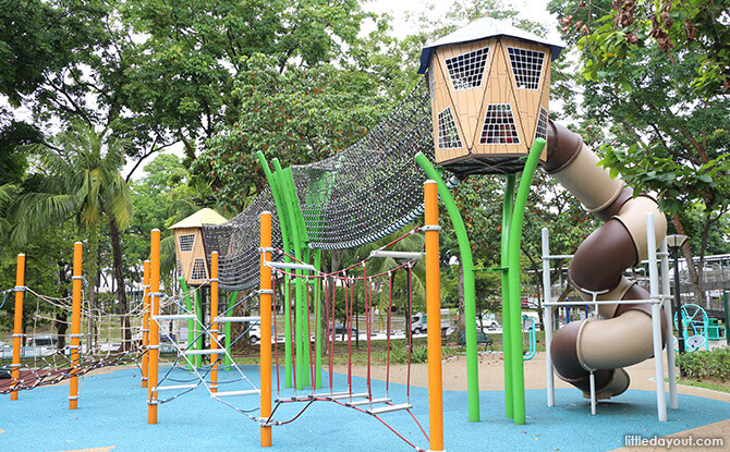 Two rustic “cottages” sit atop green “trees” at Jurong East Street 32. The two shelters are connected by a netted walkway. Climb a rope ladder up at one end and twirl down the slide at the other.