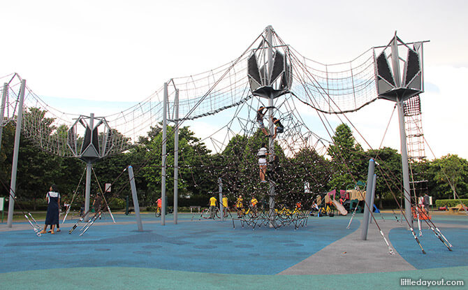 Woodlands Waterfront is not only home to one the longest jetties in Singapore but one of the grand-daddies of elevated playgrounds too. “Crows nests” are interconnected by chain-link bridges at this coastal park playground. Rope ladders and climbing nets provide multiple entryways for kids to get to the fun above.