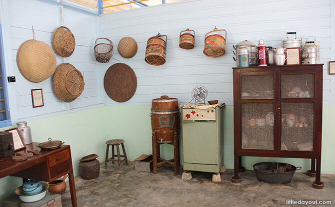 While in the kitchen, take time to check out the granite spice grinder, the kueh mould for ang ku kueh and love letters, and the various food covers on the wall.