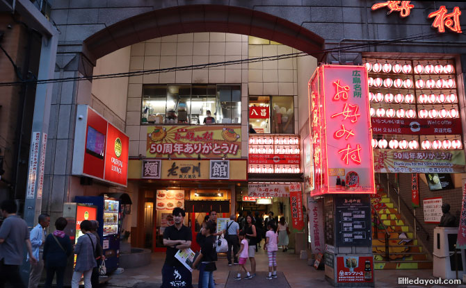 But the grandparents were done with the souvenir shopping and we had to make our way back in time to Hiroshima city to search for the famous Okonomi-mura Village. This four-storey building is dedicated to Okonomiyaki and contains 24 restaurants selling nothing but Okonomiyaki.